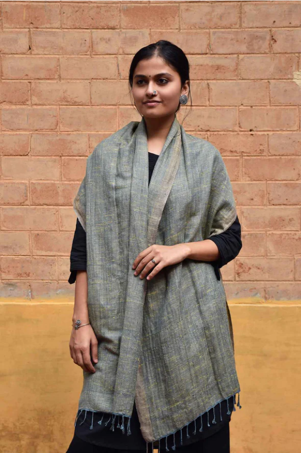 Striped Pure Eri Silk Stole | Sage Green with Orange border
